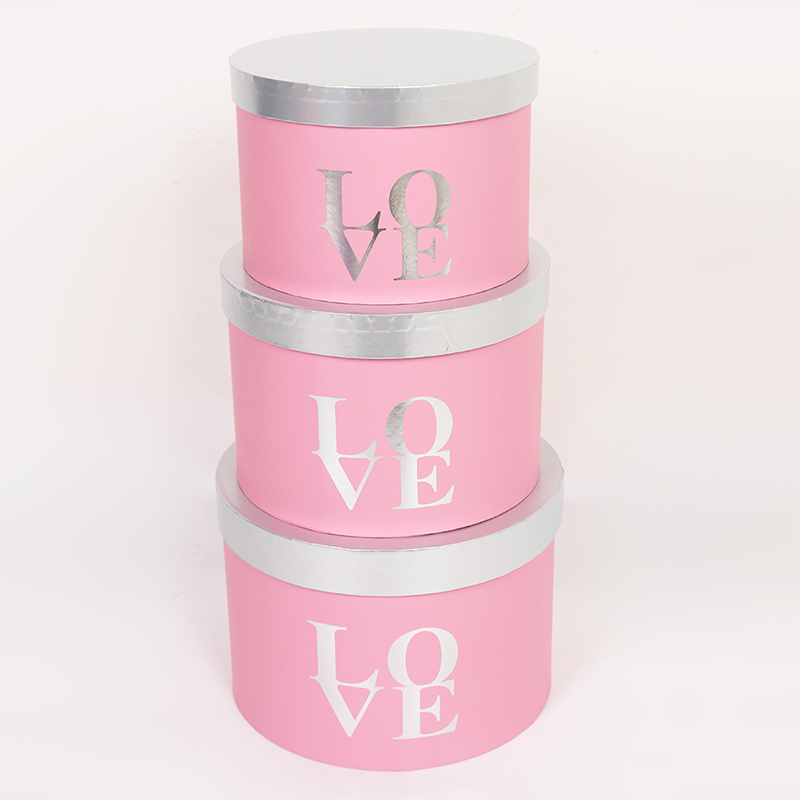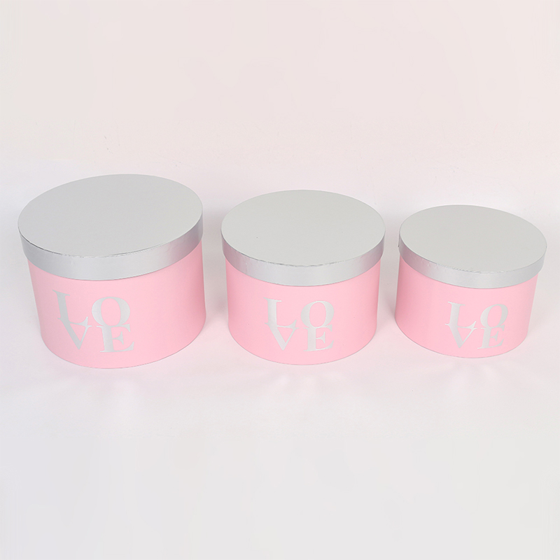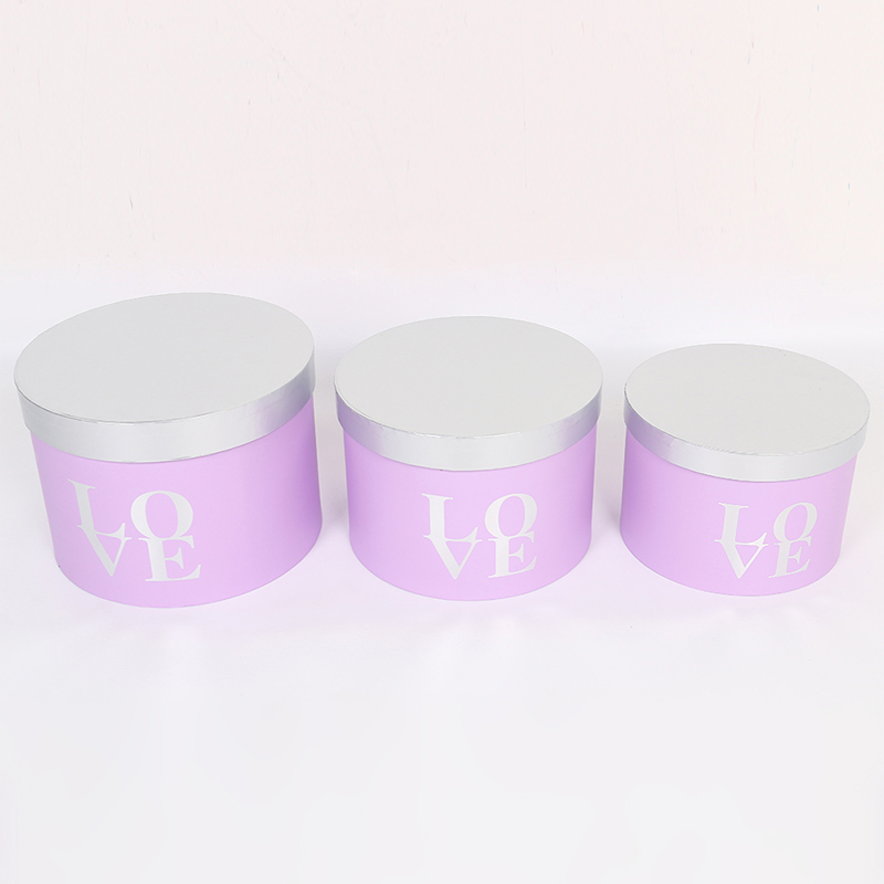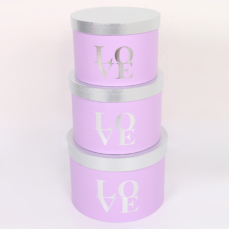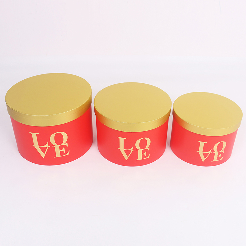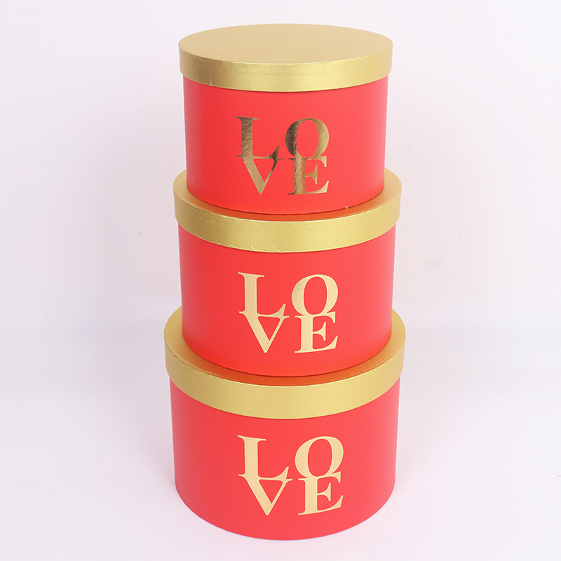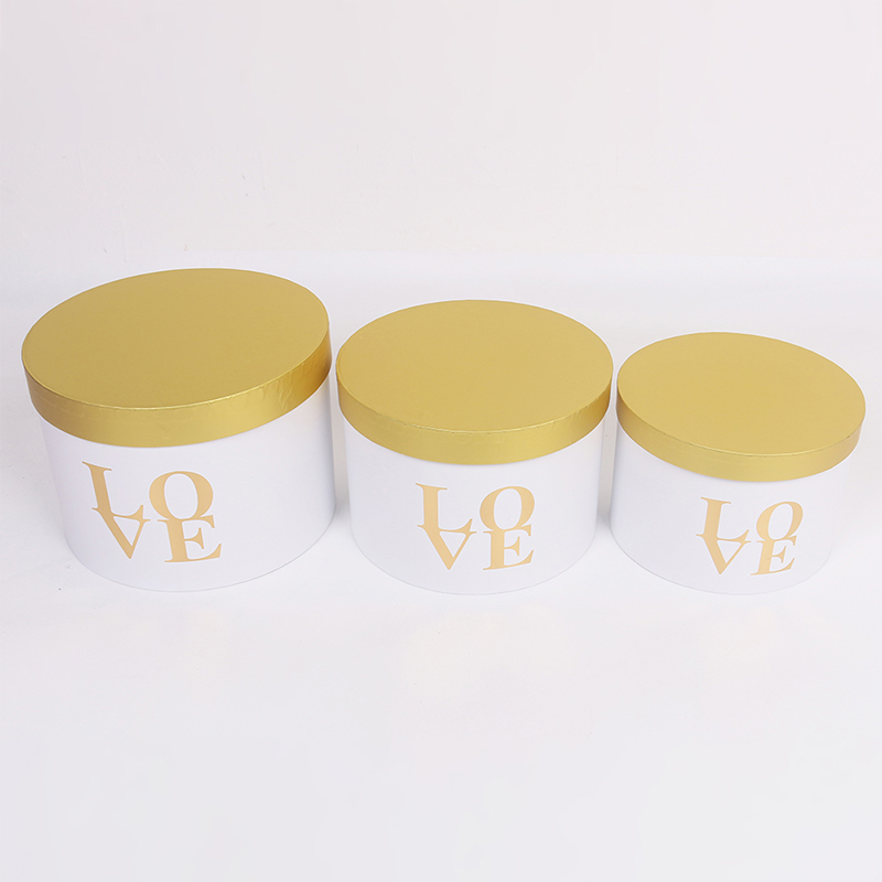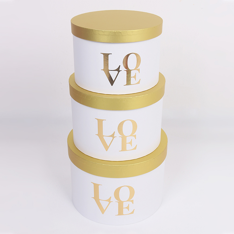 This three-piece set of round flower gift boxes features a matte finish and gold foil details, showcasing exquisite floral packaging. The set includes three cylindrical boxes in large, medium, and small sizes, suitable for various floral arrangements, from single bouquets to standard floral designs. Stacking them creates a layered and sophisticated presentation.