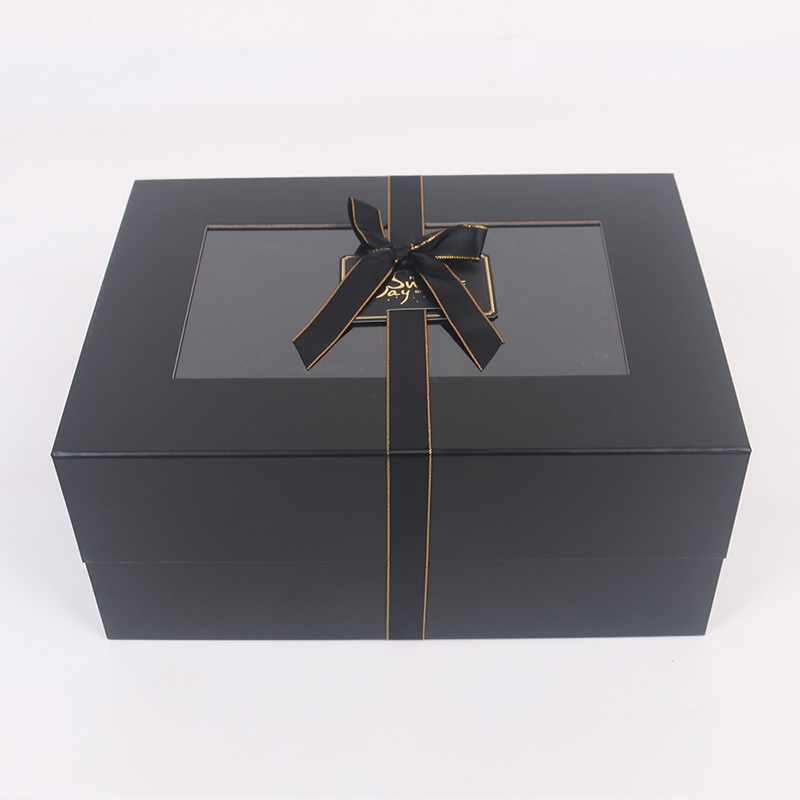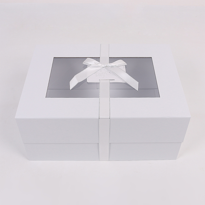 The body of the foldable gift box features a matte lamination process, resulting in a delicate, frosted surface that is scratch-resistant, wear-resistant, and less prone to leaving fingerprints. A transparent window on the top allows for a clear view of the contents, and the minimalist color scheme maintains the box's sophisticated appearance while making the gift the visual focal point. A matching satin ribbon adds a touch of elegance, creating a layered contrast between the satin sheen and the matte box, naturally conveying a sense of understated luxury.