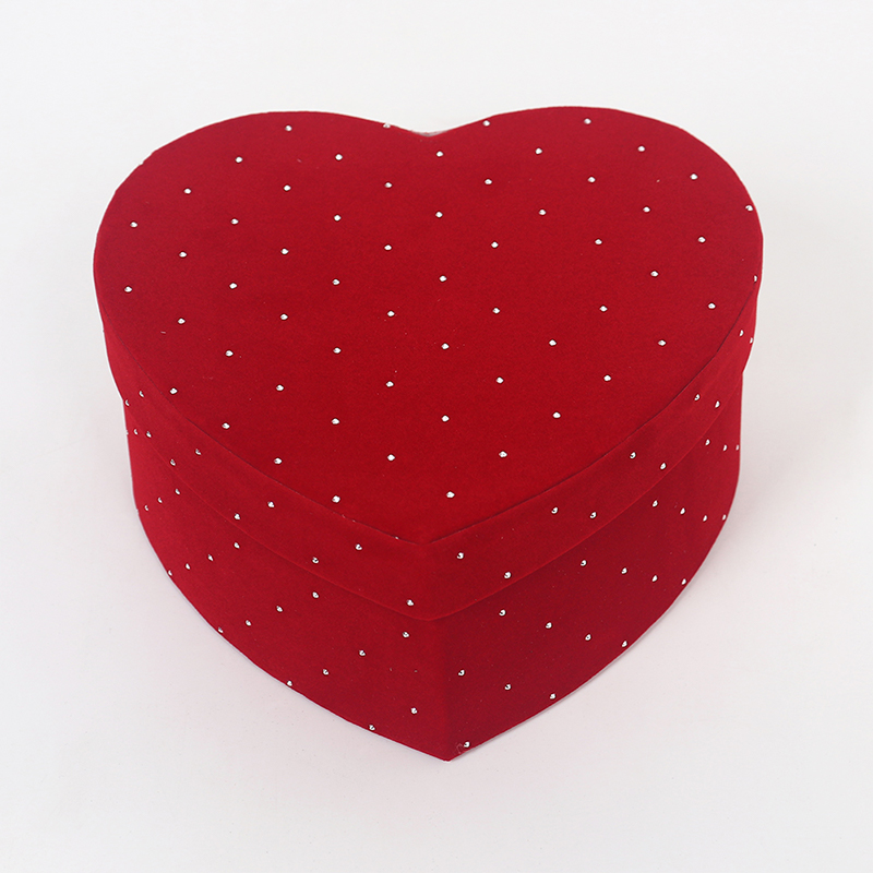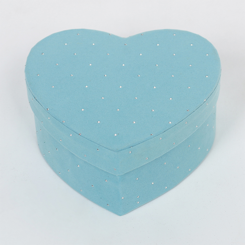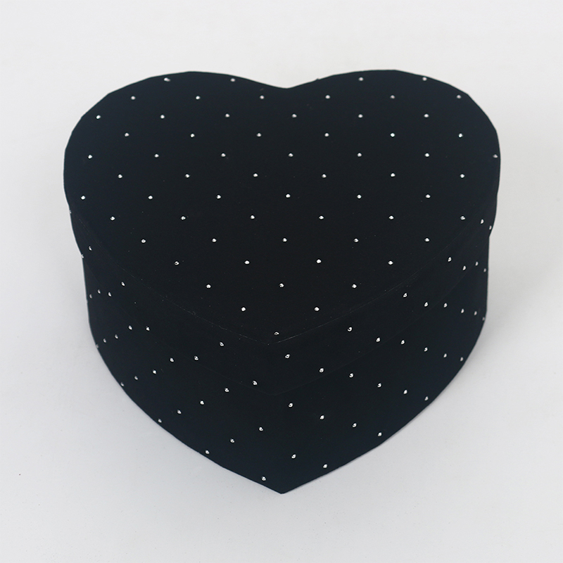 The fabric surface of the box is embellished with delicate rhinestones, creating a subtle shimmer against the dark base, preserving the softness of the flocking while adding a touch of understated luxury and sophistication. The heart shape, combined with a matching heart-shaped decoration on top, reinforces the romantic theme.