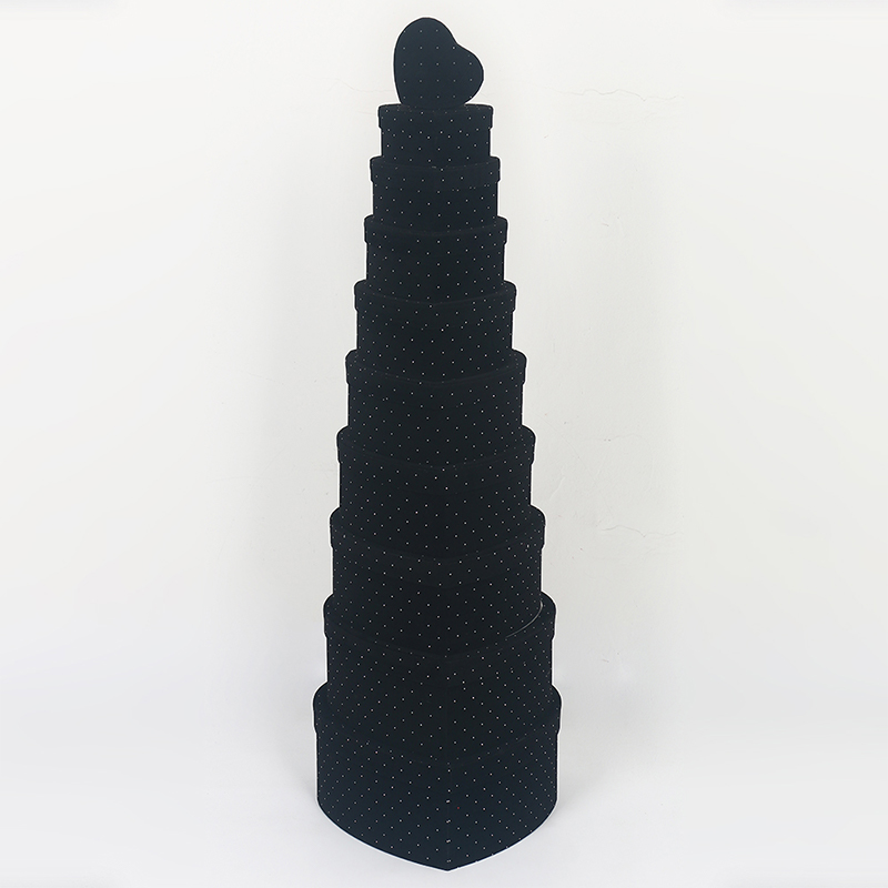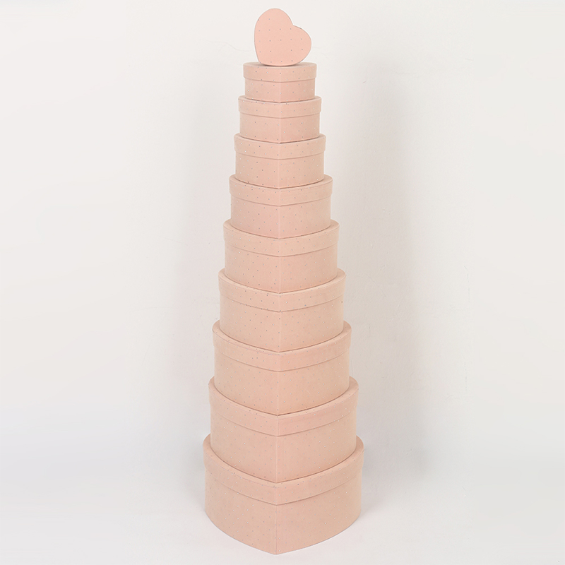 This heart-shaped gift box, adorned with rhinestones, creates a sense of occasion with its gradient design and textured details. The set includes heart-shaped boxes in multiple sizes, wrapped in wallpaper-textured flocked fabric – the flocked base is soft and skin-friendly, while the wallpaper texture adds a layer of visual interest. The spunlace lining ensures the fabric adheres securely to the box without loosening.