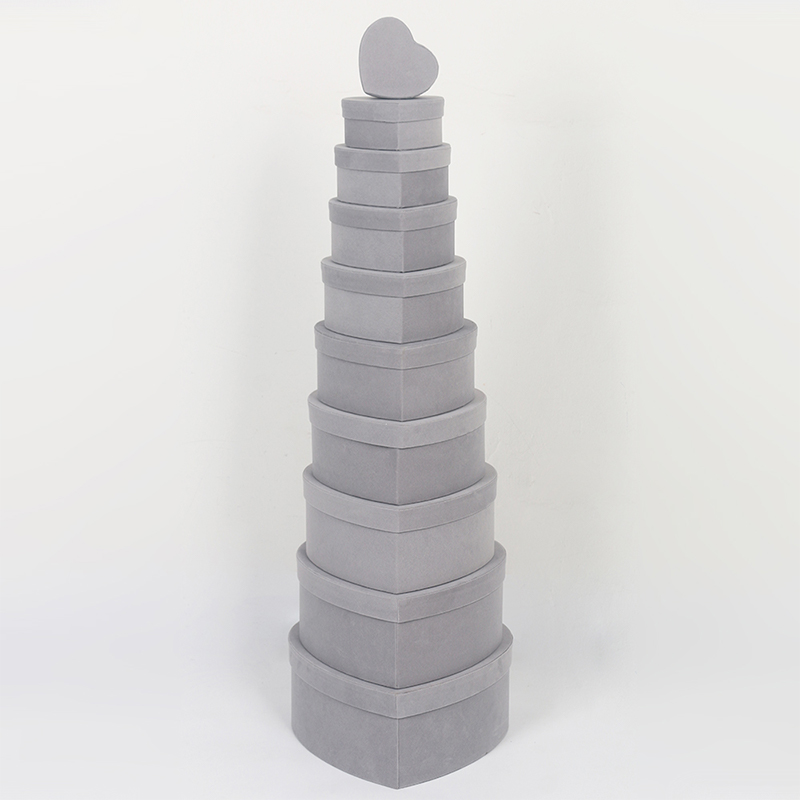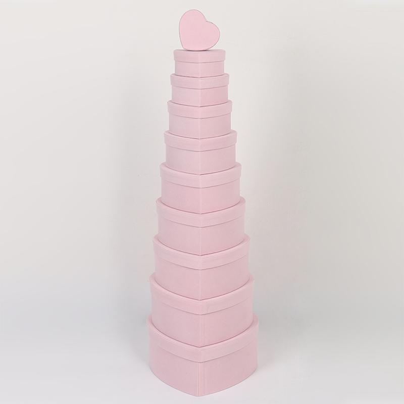 The set includes 10 heart-shaped gift boxes of different sizes, all wrapped in spunlace-backed plush fabric. The fabric is soft and fluffy to the touch, while the spunlace backing ensures a tight fit between the fabric and the box, preventing loosening or pilling, thus combining a skin-friendly feel with durability. The top of each box is adorned with a heart-shaped decoration made of the same material, enhancing the overall uniformity and sophistication of the design.