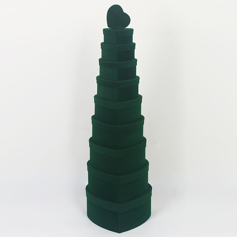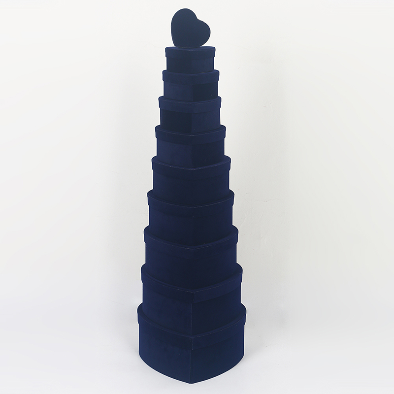 The sizes of the 10 gift boxes can be customized, allowing for adjustment of the size gradient based on the specifications of the items being held (flowers, jewelry, etc.). They can be used individually as packaging containers or stacked to create layered arrangements, enhancing the visual impact of the display.